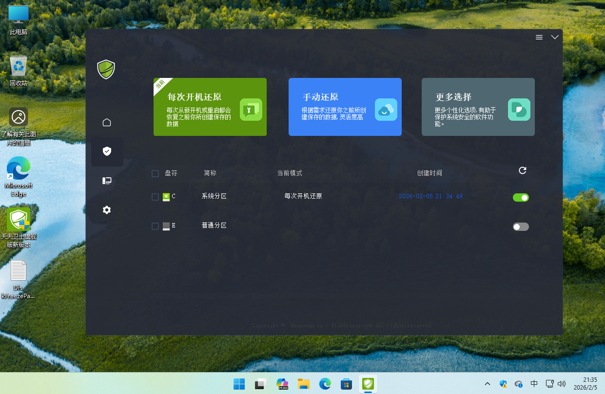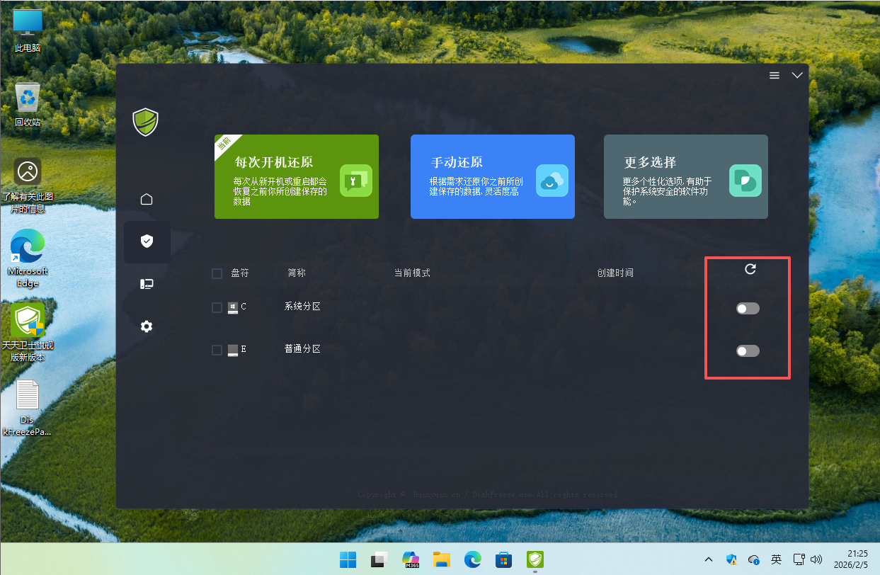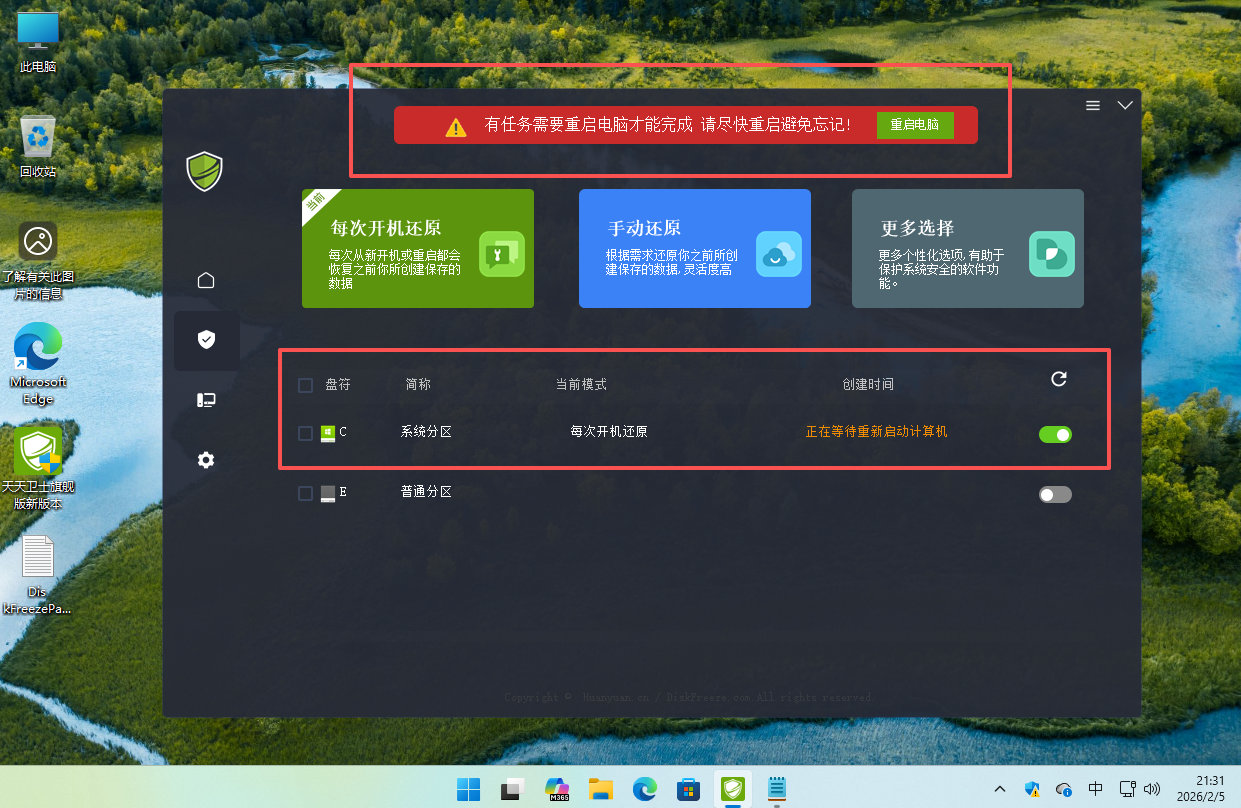 1:可以单独点击标注红色的位置进行开启的电脑指定盘的重启还原